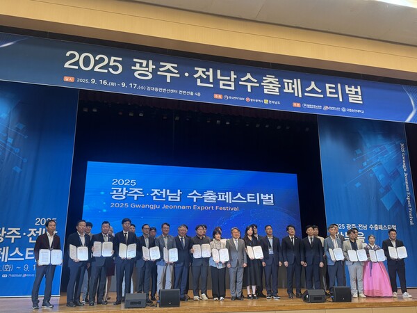 광주광역시와 전라남도가 공동 주최하고 광주테크노파크, 전남테크노파크, 국립 순천대학교가 주관한 '2025 광주·전남기업 수출페스티벌'이 16일부터 17일까지 김대중컨벤션센터에서 개최 후 포즈를 취하고 있다. (사진제공=광주테크노파크) [뉴스웍스=민문식 기자] 광주광역시와 전라남도가 공동 주최하고 광주테크노파크, 전남테크노파크, 국립 순천대학교가 주관한 '2025 광주·전남기업 수출페스티벌'이 16일부터 17일까지 김대중컨벤션센터에서 성황리에 개최됐다. |