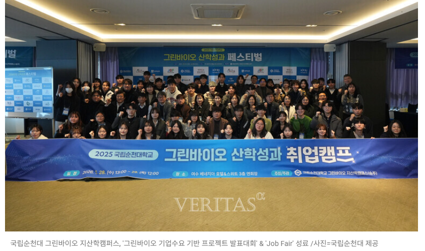 [베리타스알파=김하연 기자] 국립순천대(총장 이병운) 그린바이오 지산학캠퍼스는 지난 1월 28일부터 29일까지 여수 베네치아 호텔&스위트에서 '2025 그린바이오 기업수요 기반 프로젝트 발표경진대회'와 'Job Fair Camp'를 연계 개최하고, 학생들의 산학공동 R&D 성과와 취업 역량을 동시에 강화하는 성과를 거뒀다고 밝혔다.
