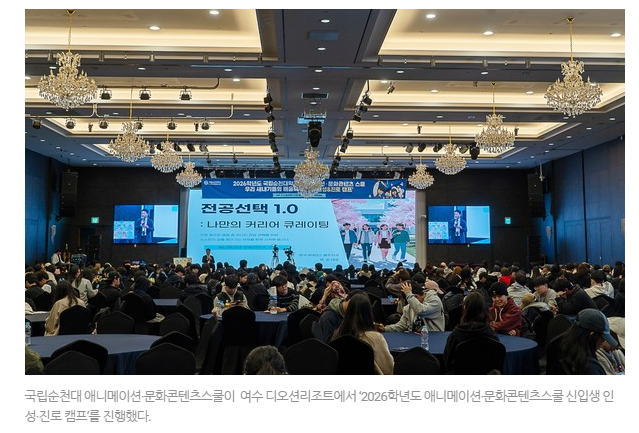 국립순천대 애니메이션·문화콘텐츠스쿨이 여수 디오션리조트에서 ‘2026학년도 애니메이션·문화콘텐츠스쿨 신입생 인성·진로 캠프’를 진행했다. 국립순천대학교(총장 이병운) 애니메이션·문화콘텐츠스쿨은 최근 1박 2일간 여수 디오션리조트에서 ‘2026학년도 애니메이션·문화콘텐츠스쿨 신입생 인성·진로 캠프’를 개최했다고 26일 밝혔다.